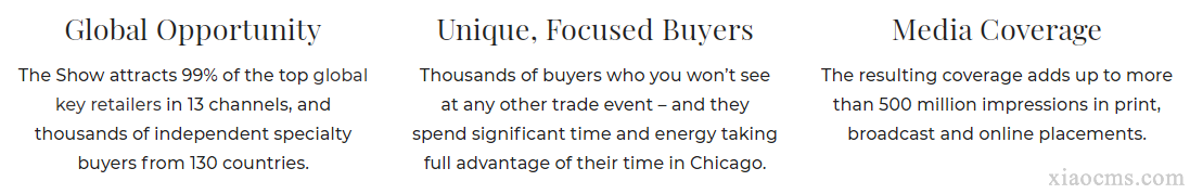 美國芝加哥家庭用品展IHA始辦于1928年,是由年零售總額達2千多億美元的美國全國家庭用品制造商協(xié)會〈International Housewares Association〉主辦,展會為全美最大、最專業(yè)的家庭用品展會,位列美國前10大展覽會之一,也是世界上最大、最具有影響力的家庭用品及家用電器專業(yè)博覽會之一,過去數十年,在主辦單位的經營之下,2013年吸引超過2137家美國及43個美國以外廠商參展,和來自美國超過5.5萬人次及其它125個國家5000人次的買家前來參觀采購。美國芝加哥家庭用品展在美國前25大零售商中95%至少會派出一人參觀此展會,在參觀的買家中來自許多通路商,包括批發(fā)商和零售商及不同的零售通路,還包括快速增長的專業(yè)頻道、大型賣場、代理商等,及在這市場上是世界專業(yè)級家居用品的買家,重要的買家包括如Wal-Mart、Allied、TargetStore、Lmex、KitchenAid、SpA、Lowe' s、Macy's…海爾集團及韓國電視購物頻道等。